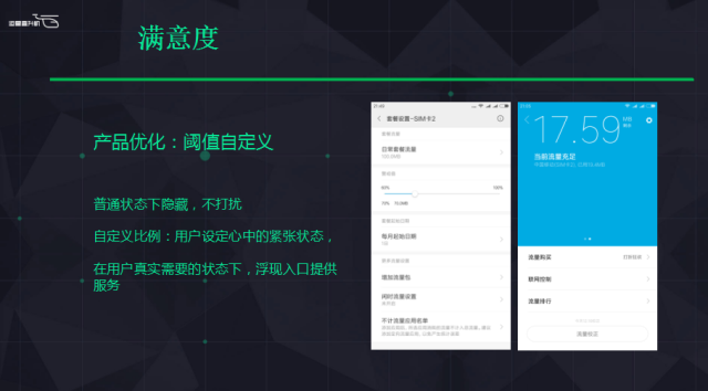 這里面有個比較重要的數字是說,在左邊圖下面看到一個設置60%到100%之間,我覺得有些朋友是比較粗線條的,他覺得這個東西不太重要盡量不要打擾我,他可以設置到10%。有些用戶是說我比較在乎,每個月的流量也不多,緊接著就可以設定。這個極限值相當于是用戶自己去設定心中的目標,這樣比較靈活,比較能夠配合他,不會過早提示他,也不會太晚提示他。因為提示他的時機正好是他需要的時機,這是我們基于用戶場景做的細節。