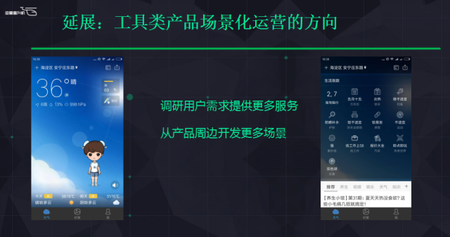 我在主要負責工具運營之前,也分析了很多行業里面基于產品場景+運營場景的一些工作。比如剛才一開始我在海龜那張圖時給大家埋了一個伏筆,計算器、導航、指南針這些東西覺得不需要運營,其實這句話到今天來講有點問題,做一個產品肯定是有商業目的的。除了一些狂熱愛好者和發燒友做產品以外,一般的產品公司都有自己的商業目的,那就是怎么去盈利?開辟盈利場景?比如說計算器可以算社保,算五險一金,算房貸。這個背后的邏輯是說,既然你算房貸,我可以給你提供貸款,算五險一金我可以給你提供理財服務,算一算一年之后的收益,通過這些場景來轉化一些廣告。