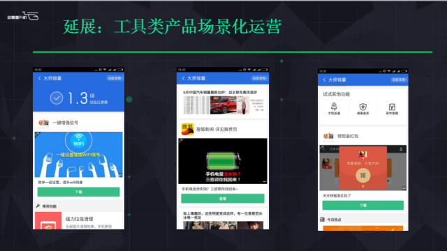 這是獵豹清理大師,最早它在海外是非常賺錢的軟件,也是各家互聯網公司作為成功案例參考的。其實它是截取了槽位的流量,前面你在垃圾清潔大師的時候去清理垃圾去點省電都不去打擾你。然后垃圾清理完之后,讓你做更多的事情。第一切入點提供更多的內容,我清理完流量之后,是不是想看怎么省電,或者是怎么手機加速,或者是軟件管理。它告訴你你是一個在乎手機內存的人,可能在乎你手機的速度,在乎你手機里的軟件是否有必要留著。它就提供更多的功能,通過功能拉伸用戶的停留時長,延長用戶的路徑,甚至在里面制造一個回廊,從一個功能把你帶到另外一個功能,然后再帶到第三個功能,可能第三個功能再把你帶到第四個功能。以前的功能是我清理完垃圾目的達到走了。現在是把你的功能拉長,讓你從A點到B點到C點,最后把其他的資訊廣告插到B點到C點路徑之間,然后制造廣告場景。它里面的方式其實很不合適很突兀的,但是他因為知道你用垃圾清理大師的目的去管理你的手機,他把管理功能和一系列的功能進行穿插排列,讓你在不停找下一個功能路上看到這個廣告。然后他的廣告也做了很好的偽裝,中間放一張圖,其實就是搜狐新聞的廣告。它中間也有資訊,里面有科技類資訊、玩具類資訊、科技前沿、娛樂八卦等,基于這些場景做了很多的開發。里面的點擊量很高,從無到有開辟了很多的廣告位,從而讓公司實現了在工具類產品上創收。