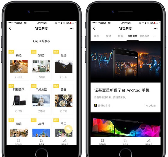 無需安裝注冊,掃描二維碼即可閱讀「輕芒雜志小程序」的內容。「輕芒雜志小程序」直接使用微信的賬號體系,用戶無需注冊即可直接閱讀「輕芒雜志小程序」內超過 160 本精選興趣雜志:涵蓋家居、美食、護膚、藝文、寵物、運動、科技、旅行、手工等所有生活領域。從入門知識,到好物、配方和去處,每天更新適讀好文章。