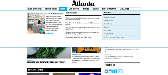 Atlanta Magazine 的大型導航菜單給人的體驗就非常流暢,下拉菜單中嵌入了大量的鏈接。由于響應式的滑動導航在移動端上也已經很常見了,這使得它還輕松兼顧到了移動端的設計。