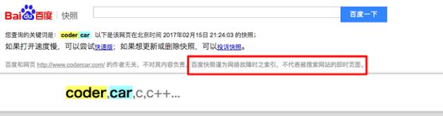 首先,讓我們先為入門(mén)站長(zhǎng)普及一下快照的基本概念,例如搜索『codercar.com』出來(lái)的百度快照截圖,請(qǐng)注意紅框部分的描述: