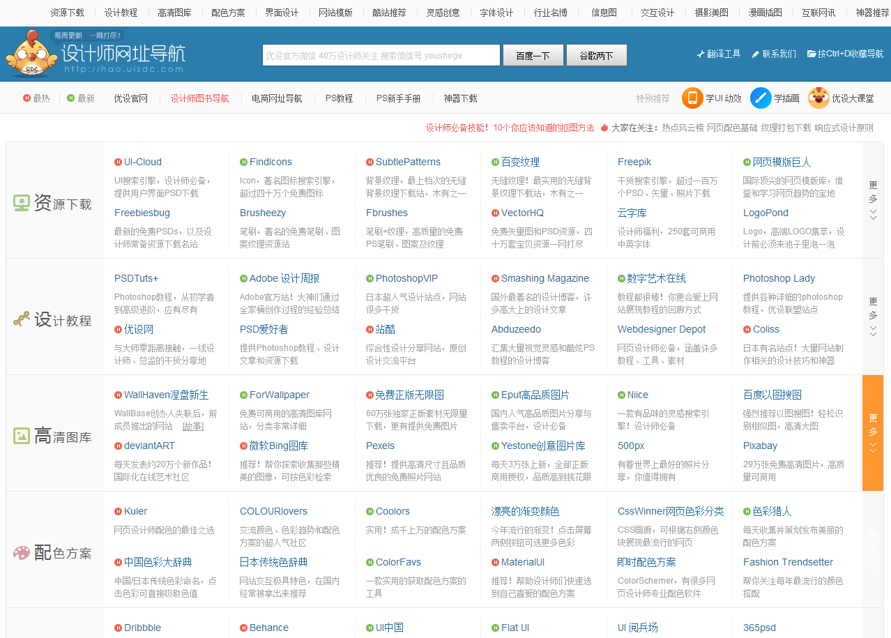 這里有超級多的干貨,各種PS插件、設計師神器和素材打包下載,最重要的是經常會有大神講座,參與的方式一般是轉發微博。不知道大家有沒有關注優秀網頁設計的微博,其實就是優設網的官微呢。另外,他們家的設計師網址導航也非常實用!有需要的小伙伴們可以直接改成瀏覽器主頁。(正經臉)