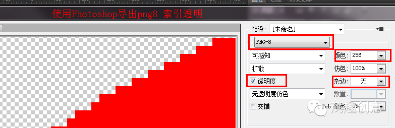使用Photoshop,存儲(chǔ)為web所有格式,按照如下圖片的紅色邊框配置,可導(dǎo)出png8索引透明