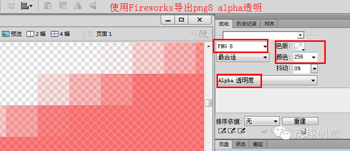 Firewoks中,在優(yōu)化面板,按照如下圖片的紅色邊框配置,可導(dǎo)出png8 alpha透明。