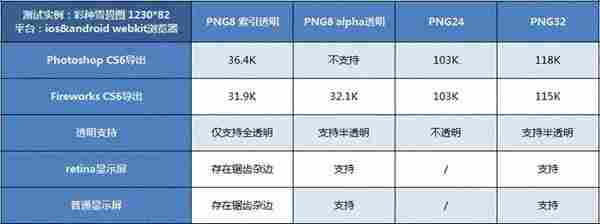而經(jīng)過(guò)筆者使用多張雪碧圖測(cè)試后使用Fireworks導(dǎo)出的『png8 alpha』,在手機(jī)端的支持是比較好的~不僅文件體積小,節(jié)省流量,而且半透明效果良好