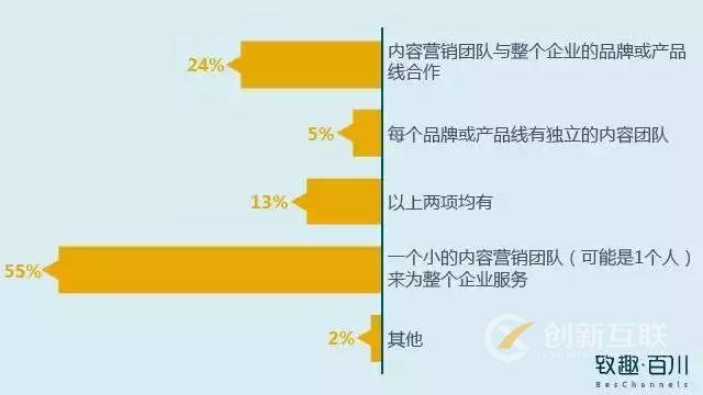 cmi發現,在北美 98%的 b2b公司,都開始有專業的b2b內容團隊來為整個企業服務;24%的企業,內容營銷團隊與整個企業的品牌或產品合作;甚至還有5%的公司,每個品牌或產品均有獨立的內容團隊。當然還有13%的企業,不僅集團層面,而且每個品牌貨產品線也有內容團隊配置。