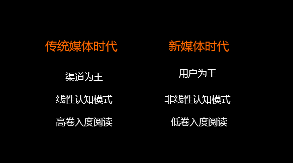 傳統(tǒng)媒體時代,人腦的認知模式是“線性的、高卷入度的”,新媒體時代,認知卻是“非線性的、低卷入度的”。就像你閱讀一本10萬字的書,你會抽出沉浸的時間,從頭到尾線性地讀完,而你在網(wǎng)上閱讀一篇1000字的文章,中途可能會通過文中的超鏈接跳轉(zhuǎn)到其他文章上去,或被彈出的廣告所分散注意力。