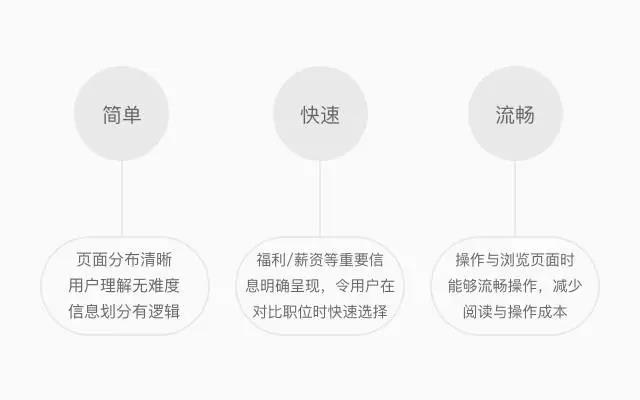 快速:福利與薪資等用戶較關(guān)注的核心信息,能夠一目了然的呈現(xiàn),幫助用戶在選擇職位時(shí)能夠清晰對(duì)比,助其快速選擇