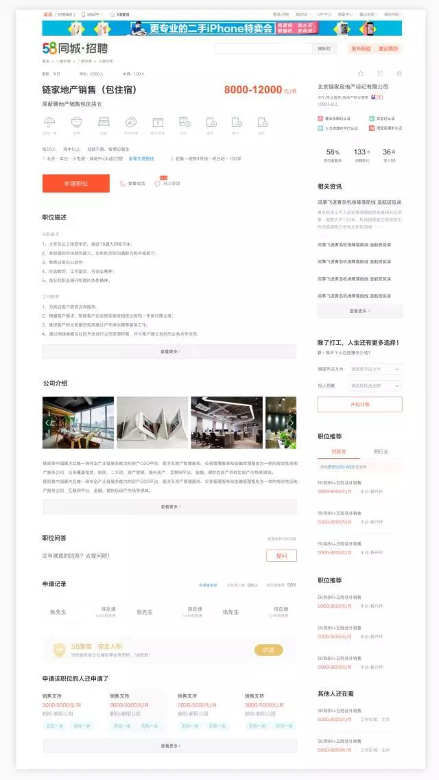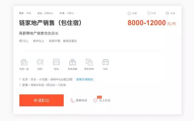 橫向?qū)Ρ日衅概c其他業(yè)務(wù)線的詳情頁,如房產(chǎn),招聘與其有較大區(qū)別。招聘的詳情頁以文字信息為主圖片為輔,字段的長短無法控制,如用平鋪形式則使信息呈現(xiàn)較為分散、混亂,無法很好的區(qū)分出信息的類別區(qū)域;而房產(chǎn)和二手車的詳情頁以圖為主字為輔,塊面感很強(qiáng),大部分的圖能夠自發(fā)劃分出區(qū)域。