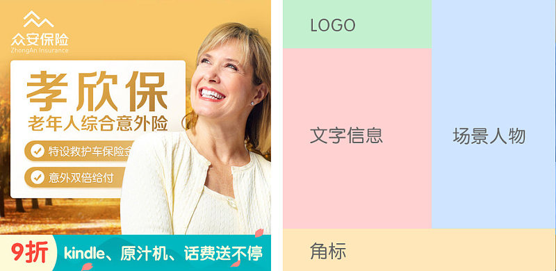 主要由文字說明信息、烘托氣氛的場景和人物圖片、運營性質的角標和底標(可選)、公司logo,這四個主要部分組成。