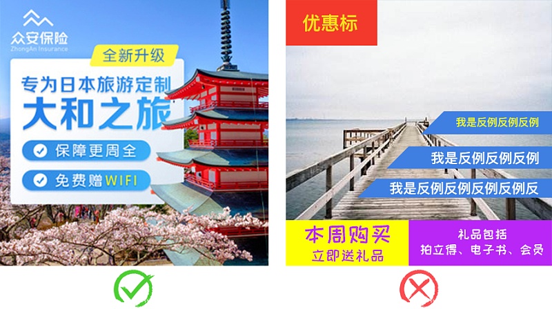 產品主圖的很大面積是由配圖組成,構成了用戶對這個保險的第一印象。因此模糊的圖片、灰暗的色彩、雜亂的背景都會讓人產生粗制濫造、隨意的感覺,很難讓買家產生安全感。