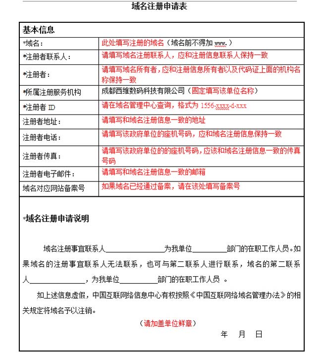 注冊及填寫申請表時注意:要求注冊時填寫的注冊單位名稱與機構代碼證名稱、公章名稱、申請表上填寫的單位名稱完全一致,GOV域名只能由政府機關注冊,其他機構一律不得注冊GOV域名!違規注冊將直接刪除不退款。