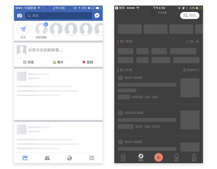這種形式一般用于內(nèi)容框架固定的頁(yè)面,如果頁(yè)面可能會(huì)出現(xiàn)空數(shù)據(jù)的情況也不宜使用。像下圖的Facebook首頁(yè),簡(jiǎn)書的首頁(yè)和發(fā)現(xiàn)頁(yè),頁(yè)面結(jié)構(gòu)固定,且內(nèi)容不會(huì)為空(除非網(wǎng)絡(luò)異常導(dǎo)致加載失敗),就很適合用Skeleton Screen的加載形式。配合前面講的優(yōu)先加載的方式,效果會(huì)更佳。