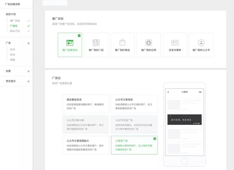 并在廣告創(chuàng)建流程中選擇你的推廣目標(biāo),但是,現(xiàn)在的情況是小程序廣告,只支持推廣品牌活動和商品。選擇好目標(biāo)之后,在“廣告位”里勾選“小程序廣告”。