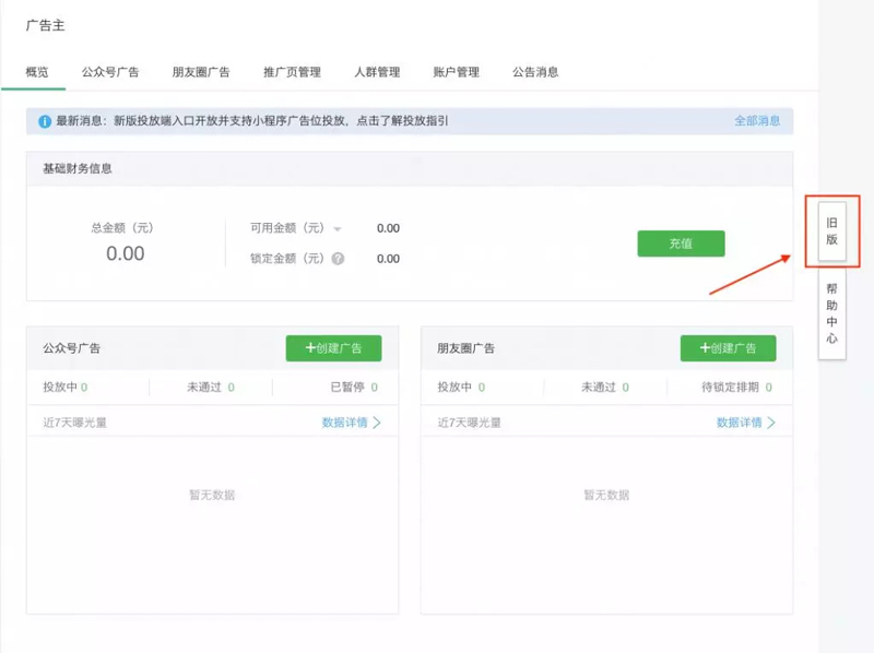 第一步、登陸微信公眾平臺,在左側(cè)側(cè)邊欄選擇“推廣”——“廣告主”,并在右邊的頁面中選擇“新版”。