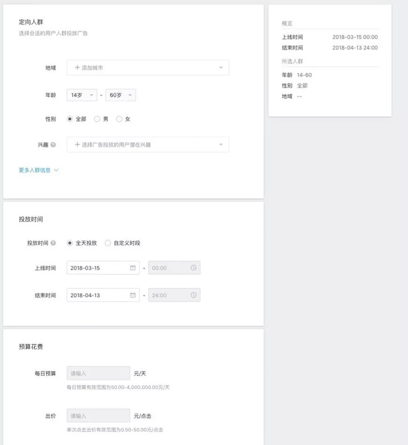 第三步、完善投放細節(jié)信息,例如:定向人群、投放時間、預(yù)算花費等。