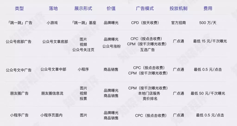 通過上面的表格我們可以簡單地了解到,雖然在平時使用微信的時候?qū)V告的感知并不像微博那么強,但實質(zhì)上微信的廣告模式也已經(jīng)十分多樣化了,并且每一種模式都有其獨特的功能。