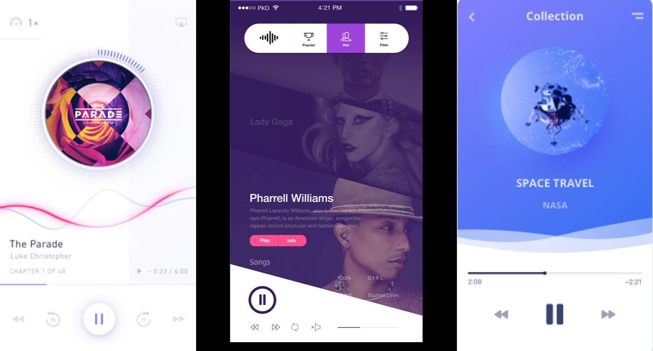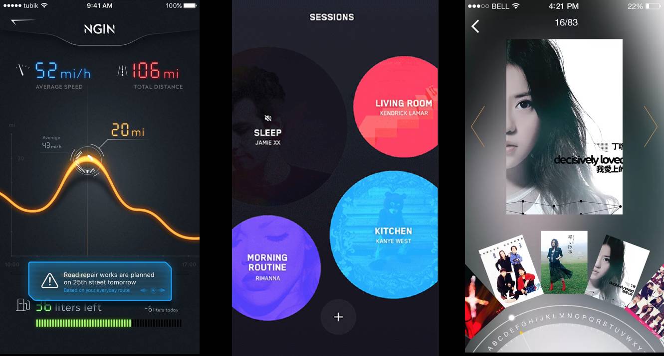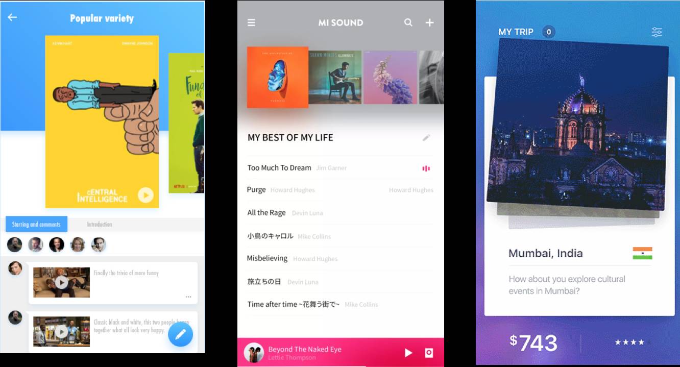 簡析:圖1在書籍封面上采用封面和背景,和消息留這種視覺錯差營造布局空間感,圖2,大的專輯封面長圖和背景很好的融合,圖3,卡片滑動時候的層疊效果。