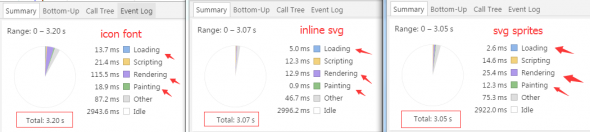 上圖SVG案例中我用了兩種不同引用方式,一種是在頁面直接inline svg方式插入的方法和用svg sprite合并后引用圖標的兩種,結果顯示svg sprite的性能是高的。