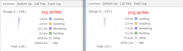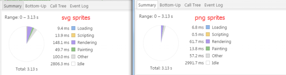 文件大小svg sprites與png sprites差不多, Rendering 也比圖片要長很多,但最終兩者之間綜合所消耗時間差不多
