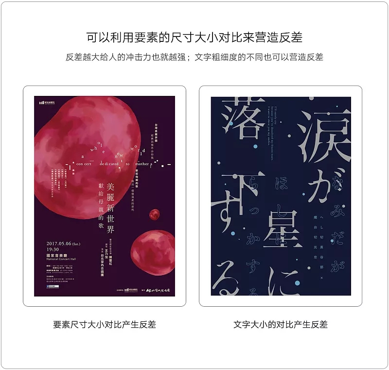 也可以利用要素的尺寸大小對比來營造反差。在設(shè)計(jì)文字時,即便是同樣的字形,筆畫粗的字感覺更硬,筆畫細(xì)的字感覺更柔,兩者搭配使用就能營造出反差。上面中“字形”是專業(yè)術(shù)語,我打算把網(wǎng)格講完就講一下字體這塊(中/日/英字體結(jié)構(gòu)與差別)。