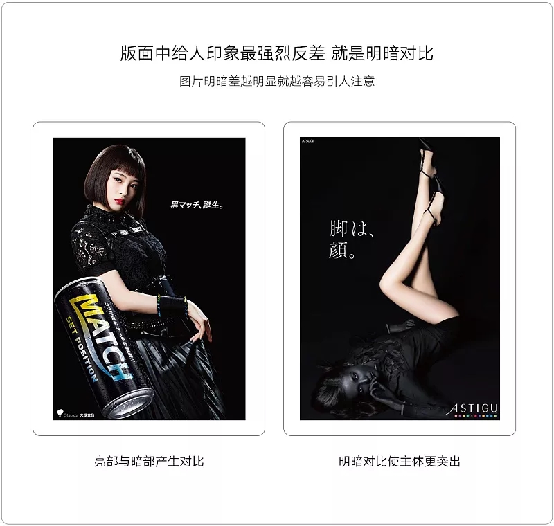 為版面添加反差效果有各種手法,其中給人印象最強(qiáng)烈的就是明暗反差(一提到明暗對比就想到了倫勃朗)。圖片明暗差越明顯就越容易引人注意;文字也一樣,越是明亮的背景、深色的文字越顯眼。
