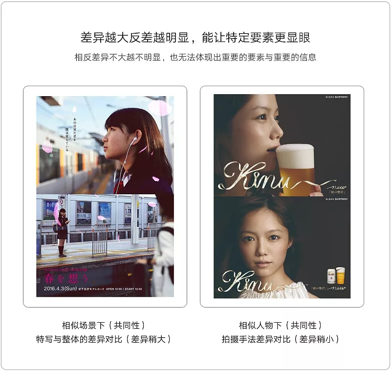 反差指的是多個要素之間的差異。通常設(shè)計(jì)師在給客戶提供設(shè)計(jì)稿時,會被客戶懟著說:這兩稿有什么差別么。其實(shí)客戶認(rèn)知中的這個“差別”就是反差的意思。差異越大反差越明顯,能讓特定要素更顯眼,相反差異不大越不明顯,也無法體現(xiàn)出重要的要素與重要的信息,就不會給讀者一種強(qiáng)烈的印象。
