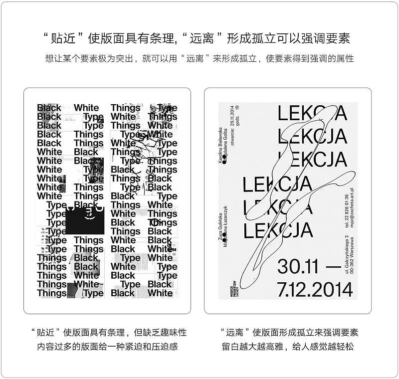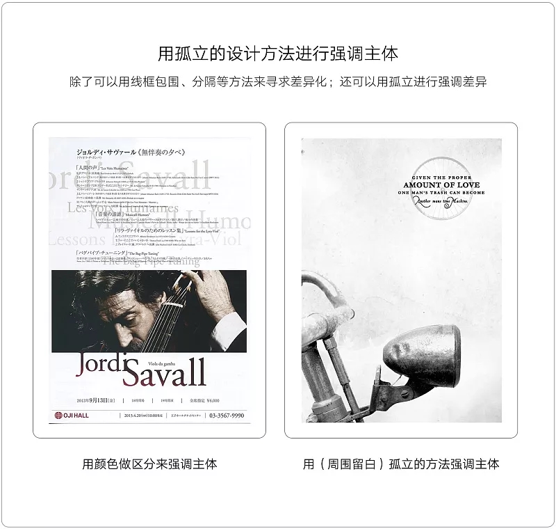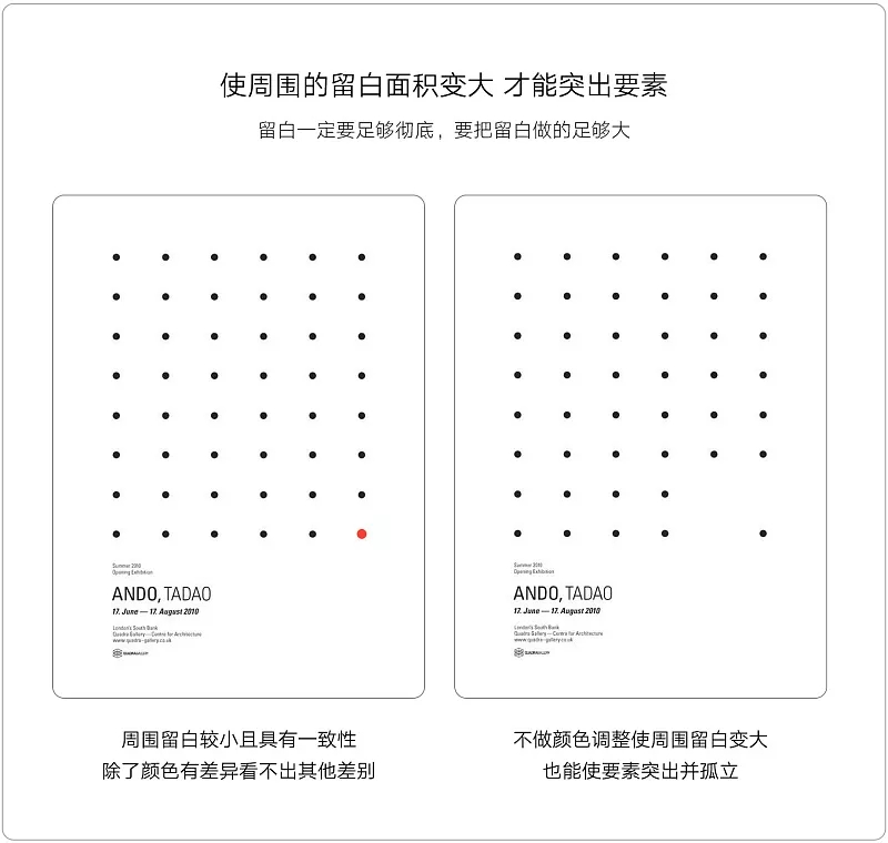 如果想讓某個要素極為突出,就可以用“遠(yuǎn)離”來形成孤立,使要素得到強(qiáng)調(diào)的屬性。孤立狀態(tài)與以后要講的“激活空間”的道理類似,但它們之間還是稍微有一些差別的,激活空間以后可能會講到,請期待吧。