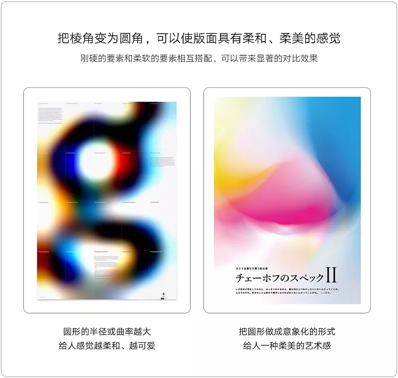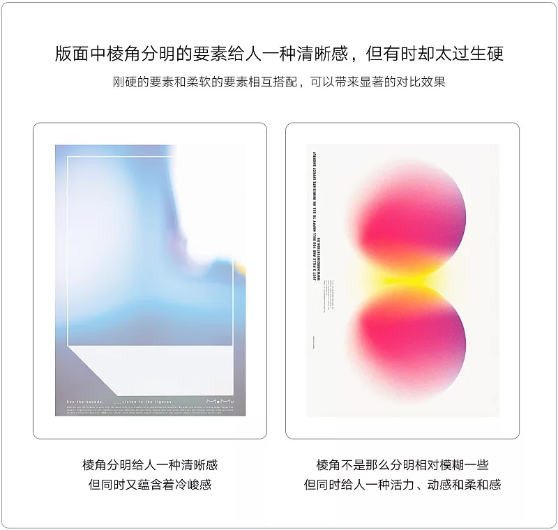若想讓版面給人一種柔美或柔和的感覺,可以在整體上把有棱角的四方形改變?yōu)槿岷偷那€或圓角。設(shè)置圓角時,圓形的半徑或曲率越大,給人感覺越柔和、越可愛。這里又涉及到一個高階知識點(diǎn)-娃娃臉偏見,大致意思是成人有棱角的臉型給人感覺冷峻堅(jiān)毅,嬰兒的娃娃臉給人感覺可愛溫和,如果成人長了個娃娃臉就代表知性。這個高階知識點(diǎn)以后會跟激活空間一起講的。