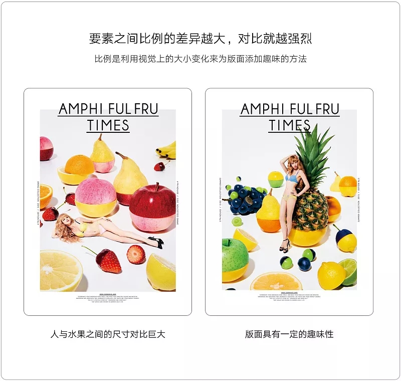 所謂“比例”指的就是尺寸大小的對比,要素之間比例的差異越大,對比就越強(qiáng)烈,給人的沖擊感也就越強(qiáng)。這里的比例單純指的是平面設(shè)計(jì)中的比例,也就是利用視覺上的大小變化來為版面添加趣味的方法。