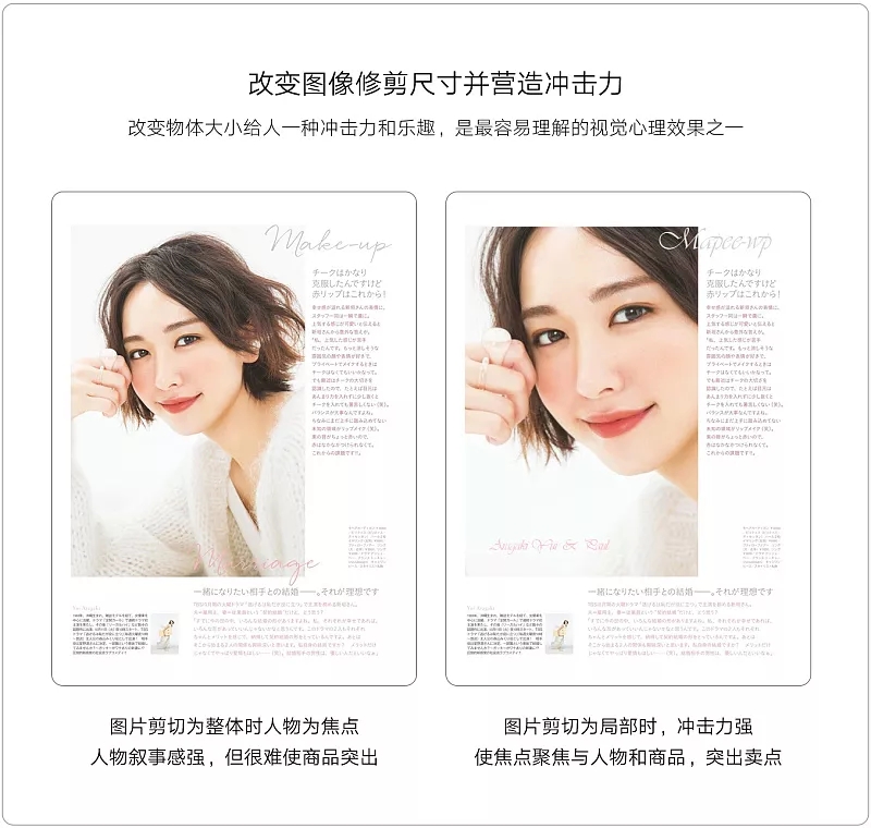 制造沖擊力的手法中,通常用對比方法營造出來的趣味感效果最明顯。例如,即使利用同樣的圖像,若使圖像的修剪尺寸不同,圖像在讀者心中的印象也不大一樣。改變物體大小給人一種沖擊力和樂趣,是最容易理解的視覺心理效果之一。這種方法在好多書中都有提到,也是一種最為常見的增加對比的方法。