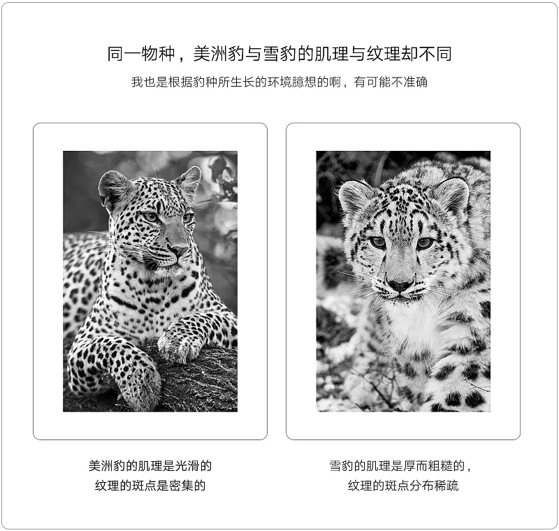 “肌理”是指物體的表面結(jié)構(gòu),與質(zhì)感的意思相近。“紋理”指的是物體的紋路,物體的花紋與條紋。舉個例子吧,肌理就像豹子身上的毛發(fā),美洲豹和雪豹身上毛發(fā)觸感是不同的,有可能一個更厚更硬一些而另一個更柔軟一些。紋理就像美洲豹和雪豹身上的紋路,雖然都是圓形狀的,但各自的紋路組成與分布是不同的。如果還是不理解的話,我就要考慮以后寫一篇關(guān)于肌理和紋理的文章了。