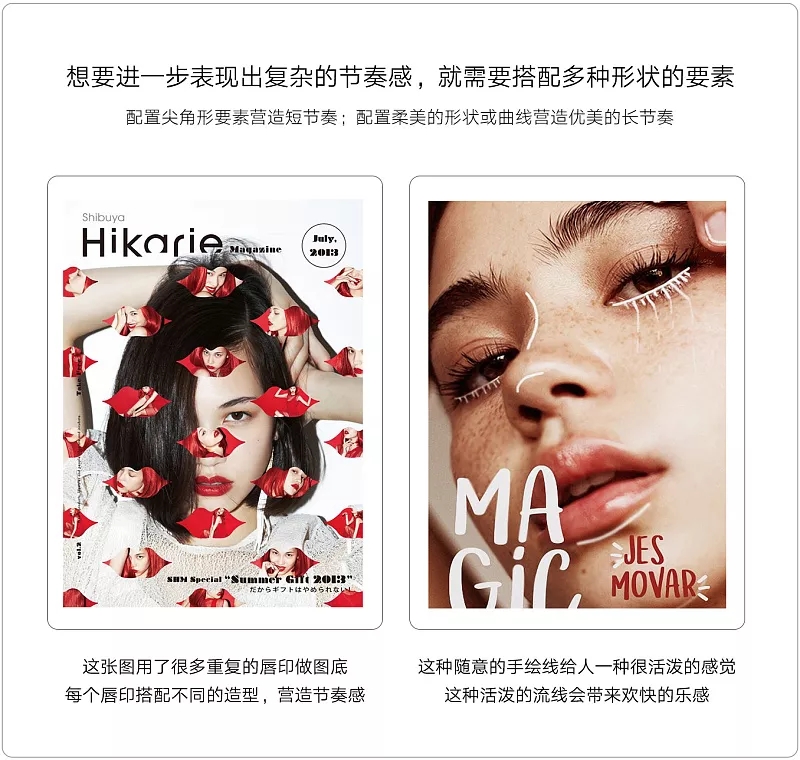 將同樣形狀的要素統(tǒng)一編排不能產(chǎn)生節(jié)奏。在大多數(shù)商品的圖片或是文章中,都很難在圖片的角度上做變化,這時若在背景上追加賦有節(jié)奏的形狀會讓整個版面具有節(jié)奏感。