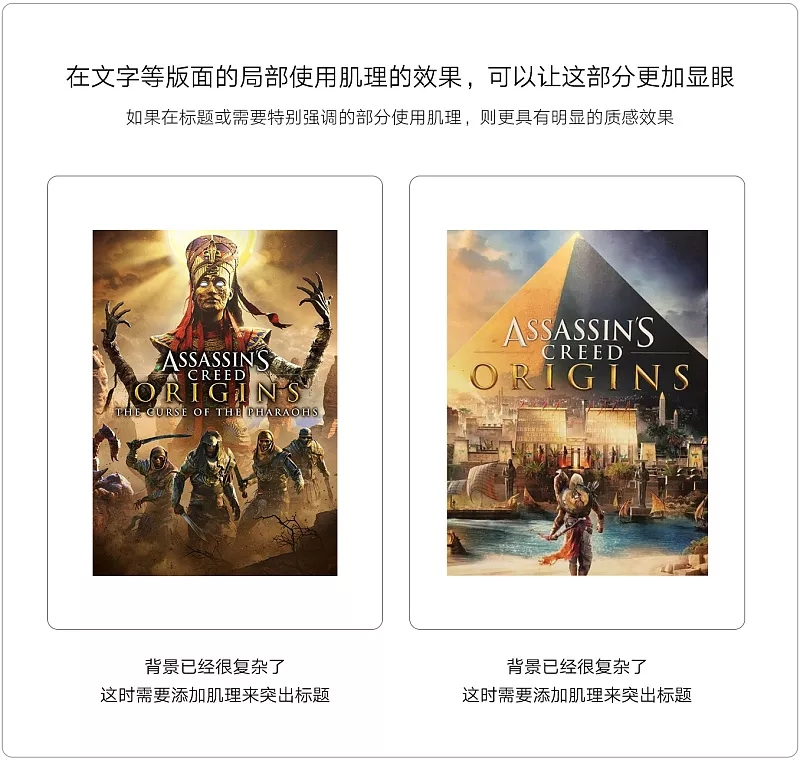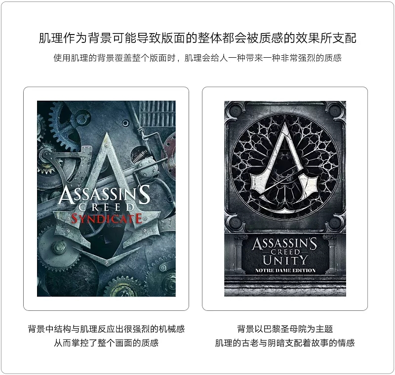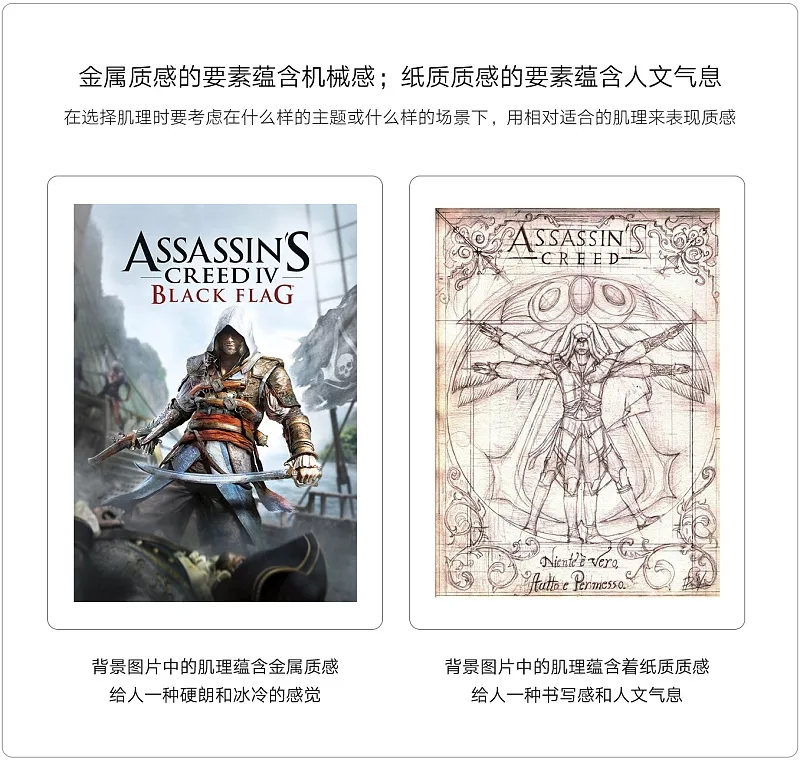 如果使用金屬質(zhì)感的要素,會給人一種強(qiáng)烈的硬質(zhì)感和冰冷感(其實(shí)就是器械感);如果使用紙質(zhì)質(zhì)感的要素,會給人一種書寫感和傳統(tǒng)感(人文氣息)。所以在選擇肌理時要考慮在什么樣的主題或什么樣的場景下,用相對適合的肌理來表現(xiàn)質(zhì)感。