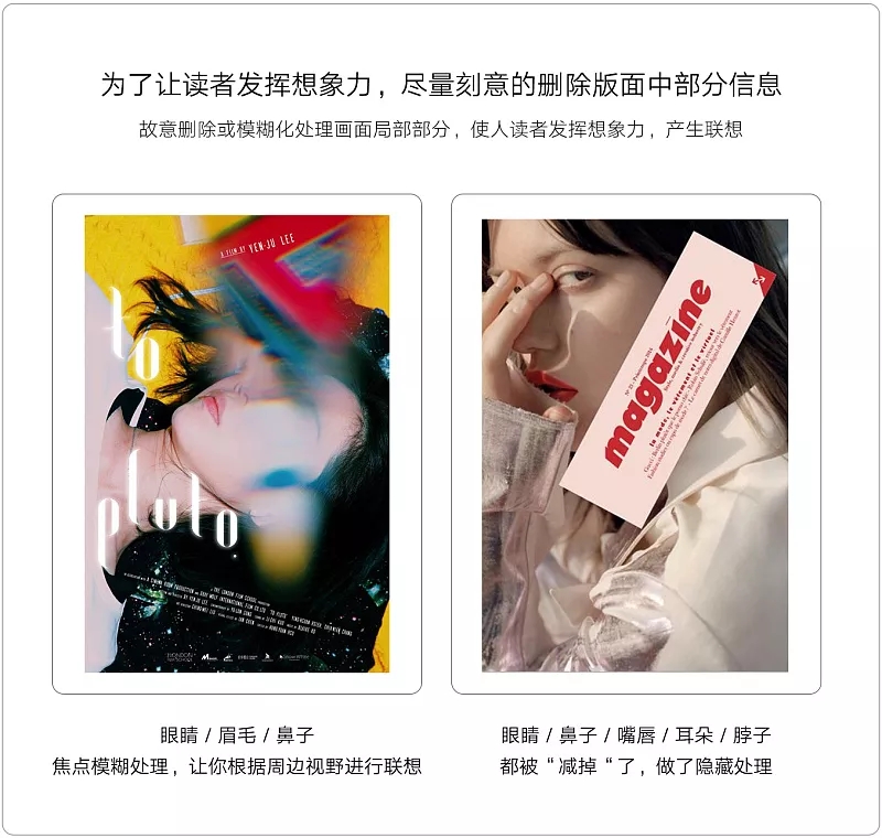 為了讓讀者發(fā)揮想象力,需要運(yùn)用減法邏輯,刻意的刪除版面中部分信息。這里又涉及到一個設(shè)計(jì)心理學(xué)的知識點(diǎn)-周邊視野。設(shè)計(jì)師通常只關(guān)注讀者的視覺焦點(diǎn),而忽略周邊視野。