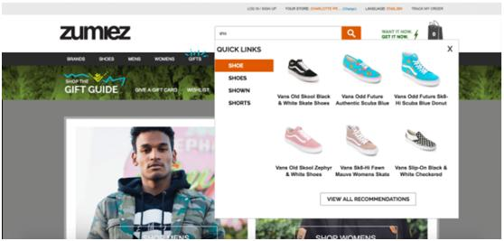 例如,美國體育用品平臺Zumiez利用行為數據來評估每個訪問者對其網站的興趣和偏好,以便它可以幫助他們在搜索欄中找到最相關的產品。在下圖中,請注意,推薦的鞋子是基于用戶以前在網站上的行為,按照性別(女性)和品牌(Vans)而做出的推薦。