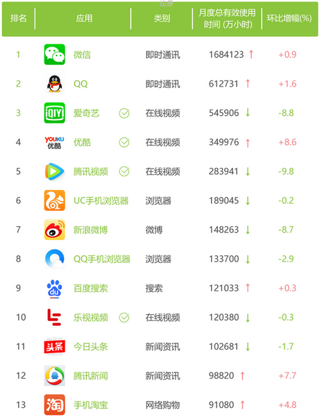 下圖是16年底艾瑞發布的APP使用時長排名,可以發現TOP10排名的APP中,大致分為5類:即時通訊類、視頻類、新聞資訊類、社交類、工具類。