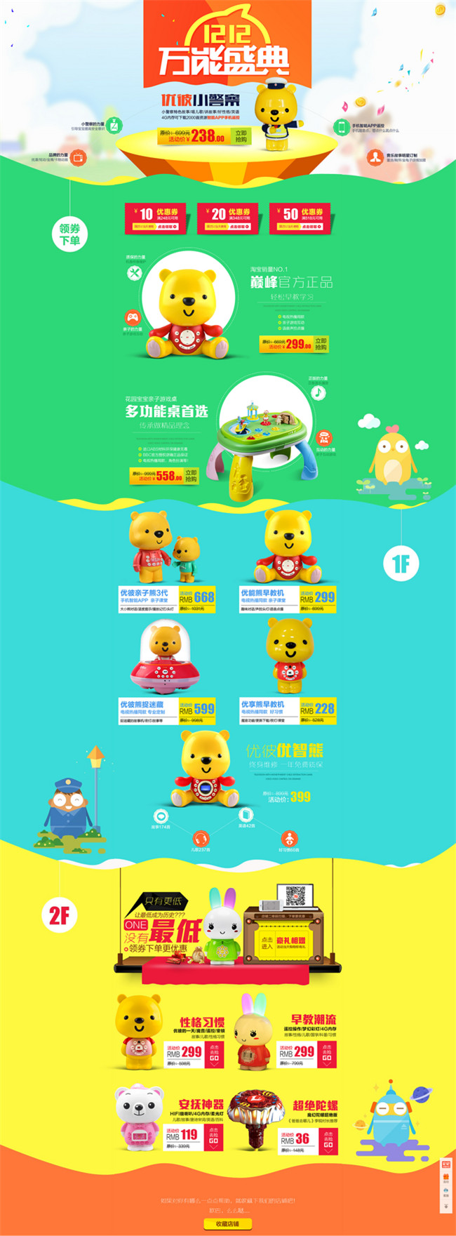 采用產品黃色為主色調,并采用藍色、綠色作為模塊設計替換色。顏色搭配很是符合孩子喜歡愛,當然孩子家長看著也甚是覺的可愛,產品可愛,給產品烘托出可愛的氛圍。