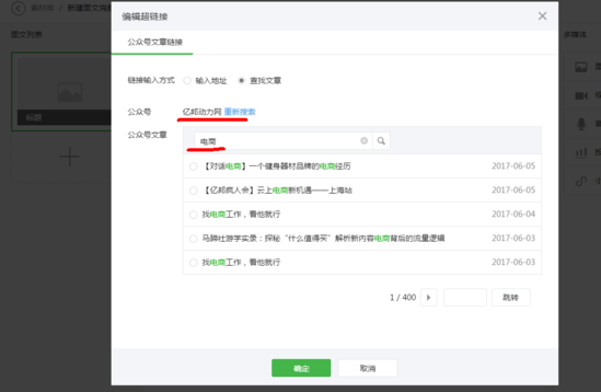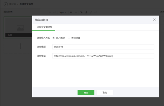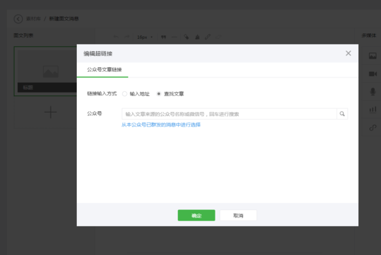 復(fù)制想要插入的公眾文章鏈接,粘貼在“鏈接地址”,后臺將自動匹配好相關(guān)的文章。或者直接插入自己賬號的文章。但目前輸入文章鏈接地址僅支持公眾號文章鏈接,無法插入外鏈。