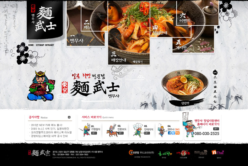 這個網站語言采用的是韓文,但是他是一家日本的拉面館。這個采用明顯可以看出,幾何設計、繪畫設計,并且附有中國風的水墨風格。