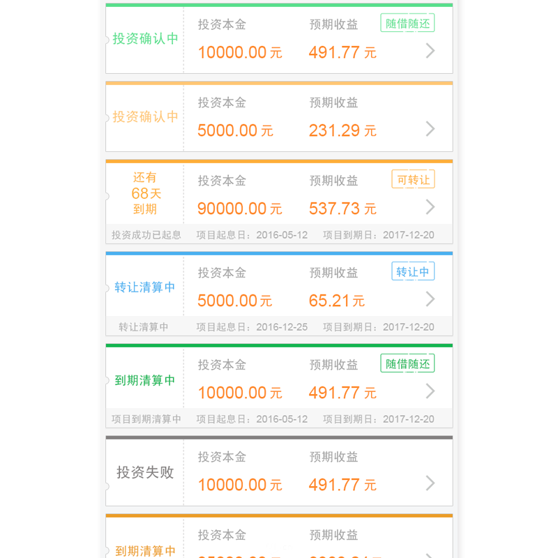 在這種情況下(3種產品類型,11種產品狀態),配色就要很小心了。首先我們要對狀態進行整合,相似的狀態整合成一種,這樣可以減少顏色的數量。當然會有人感覺六種顏色還是多,因為書本上告訴我們同一頁面中配色不要超過三種。但是我們得從實際情況出發,對于理財產品來說,用戶不太可能在同一屏中看到全部的六種狀態,也就是說用戶同時看到六種顏色的概率很小。