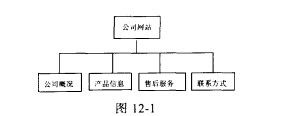 舉個例子來說明,假設(shè)某公司開發(fā)了一個軟件,想建個網(wǎng)站讓客戶多了解該公司及相關(guān)軟件,并且要求提供一定的售后服務(wù)(軟件的更新程序下載問題在線解答等),上級把這個任務(wù)交給了我們,我們該怎么辦呢?首先進(jìn)行需求分析,根據(jù)這個公司的要求,大致定為商業(yè)網(wǎng),不過由于并不要求提供在線銷售等電子商務(wù)服務(wù),所以這個網(wǎng)站的模式主要是以宣傳為主而不是業(yè)務(wù)處理。接下來收集相關(guān)信息,比如公司的概況,成果、產(chǎn)品信息、簡單的售后服務(wù)(及時提供最新的升級程序下載、問題在線解答、相關(guān)新聞發(fā)布、客戶情況調(diào)查等)、聯(lián)系方式等等,最后作出分析流程圖,由于該網(wǎng)站功能相對簡單,所以流程圖并不復(fù)雜,如圖12-1所示。