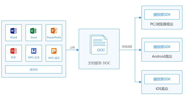 DOC提供文檔存儲、轉碼、分發播放一站式服務,您通過SDK上傳源文檔后,DOC會自動進行轉碼;轉碼成功后,通過PC/WAP瀏覽器、Android、iOS播放器SDK嵌入您的應用中,實現免插件、在線瀏覽。支持的格式有:源文檔支持doc、docx、ppt、pptx、xls、xlsx、vsd、pot、pps、rtf、wps、et、dps、pdf、txt、epub多種格式。