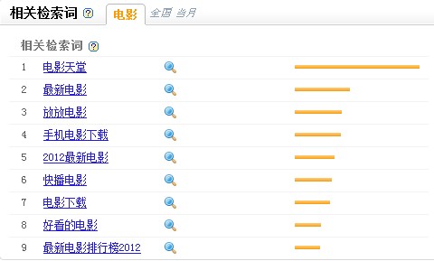 B、百度指數(shù)中關(guān)于“電影”的最熱相關(guān)詞推薦,這里hao123布局的關(guān)鍵詞有“最新電影”,“好看的電影”:
