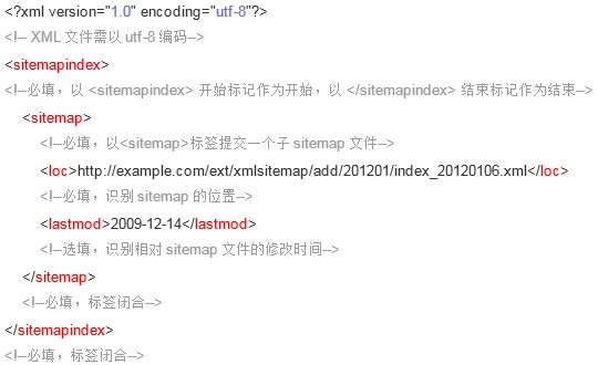 3.第三種格式樣例:Sitemap索引格式如需提交大量sitemap文件,則可將其列在sitemap索引文件中,然后將該索引文件提交。您無需分別提交每個文件。