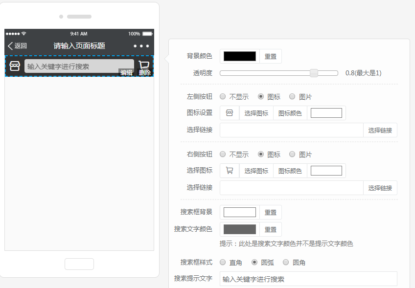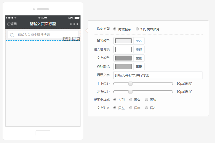 搜索欄與頂部搜索欄類似,不同點是頂部搜索欄是固定在頂部的,而搜索欄的位置是不固定的,可以自由地放位置。同樣,關于搜索頁面以及搜索結果頁面都需要提前定義好。