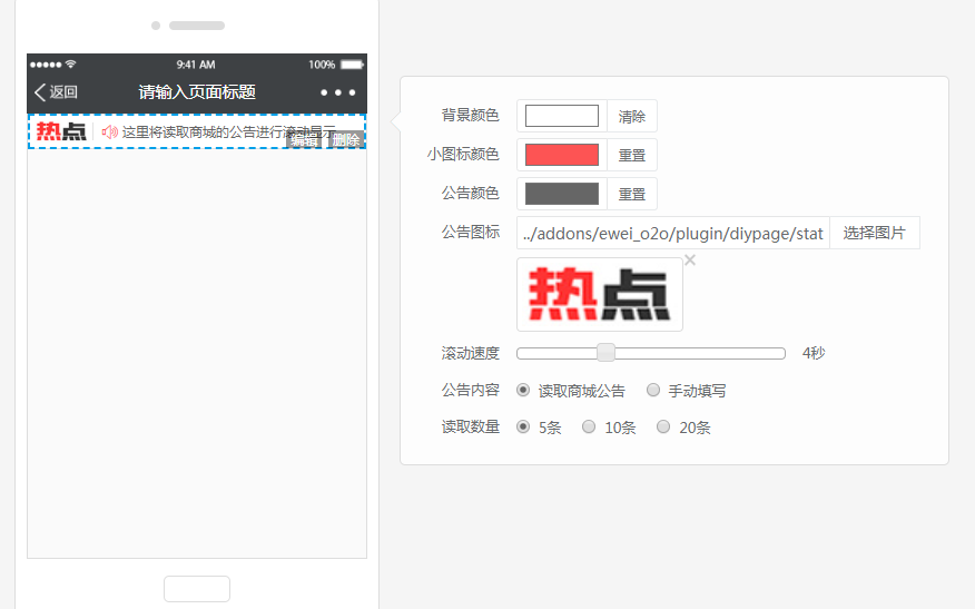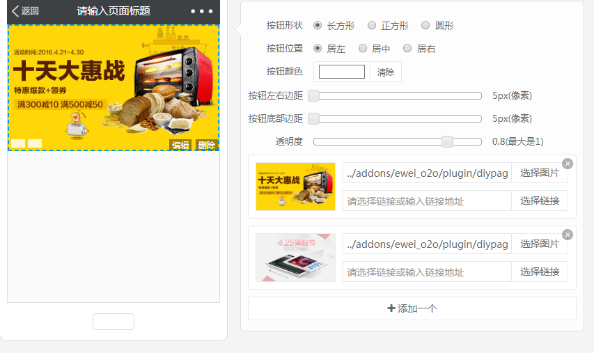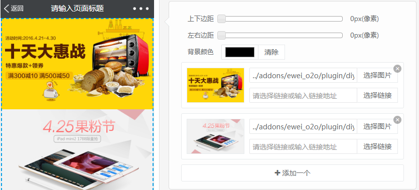 比如輪播圖我們選擇幾張的,三張的還是四張的;選擇樣式之后要配置具體的信息:我們要上傳圖片,然后為圖片設置鏈接。這些組件點擊可以跳轉到別的頁面,而不同組件需要配置的信息也是不同的,取決于組件本身。