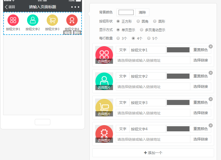 按鈕組主要應用于主要頁面,比如首頁輪播圖下方,可以是多個分類的入口,也可以是分模塊的入口;給每個按鈕定義文字,上傳圖標,然后設置跳轉鏈接,可以設置多行。